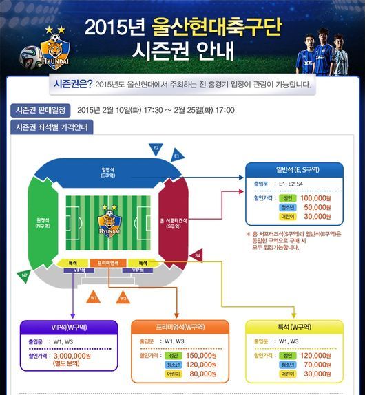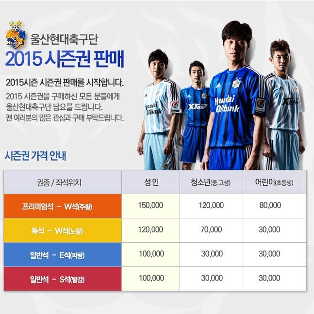 프로축구 울산현대가 2015시즌 울산현대의 홈 전경기(K리그, FA컵 최대 25경기)를 관람할 수 있는 2015시즌 시즌권 판매를 개시했다.