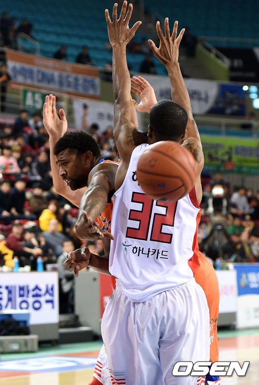 2쿼터 전자랜드 포웰이 패스를 하고 있다.