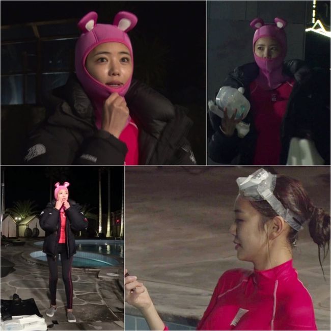 ‘띠과외’ 이태임이 핑크색의 귀가 달린 수영모를 착용해 웃음을 자아낸다.