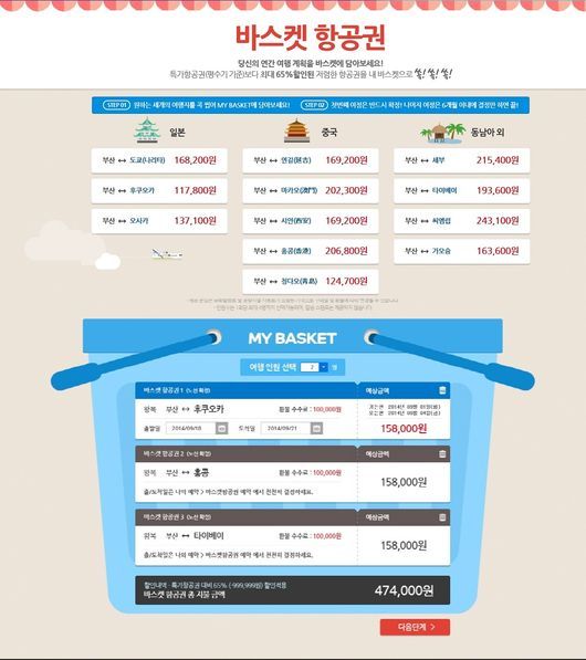 연간 3회의 해외여행을 계획하고 있는 이용자라면 저렴한 가격으로 미리 항공권을 구매할 수 있는 장점이 있다. 바스켓 항공권 구매 방법은 원하는 3곳(동일노선 가능)의 여행지를 선택한 후에 첫 번째 여행지의 출국·귀국일정만 먼저 지정하고, 나머지 2곳의 여행지의 출국일정은 구매일로부터 6개월 이내에만 결정하면 된다.