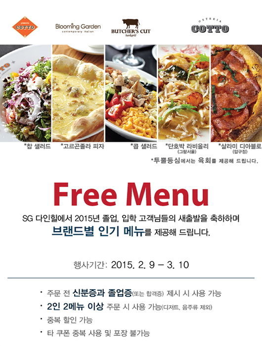 외식전문업체 ㈜SG다인힐(대표이사 이진애, www.dinehill.co.kr)이 졸업과 입학을 맞이한 학생들을 위해 5개 브랜드 12개 매장에서 오는 3월 10일까지 '졸업입학 축하 프로모션'을 진행한다.