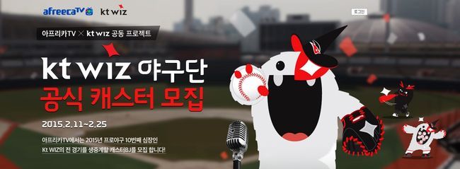 kt wiz 야구단(대표이사 김영수)은 오는 25일까지 라이브 소셜미디어 아프리카TV와 함께 구단 공식 홈페이지(ktwiz.co.kr)와 아프리카TV kt wiz 특별페이지(ktwiz.afreeca.com)에서 2015시즌 kt wiz 구단 방송 캐스터를 모집한다.