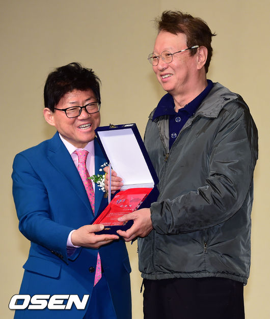 12일 오전 서울 여의도 63빌딩에서 진행된 '송해 헌정공연' 설명회 및 집행위원 위촉식에서 자문위원으로 위촉된 전유성이 엄용수 회장과 위촉패를 들고 미소짓고 있다.