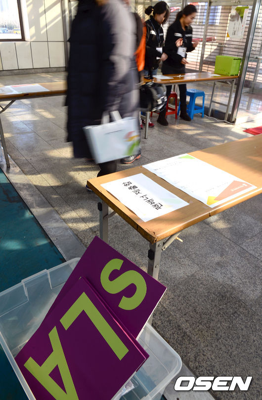 12일 오전 서울 목동아이스링크에서 진행된 '2015 사대륙 피겨선수권 대회' 빙상장 입구에 배너 수거함이 비치되어 있다.