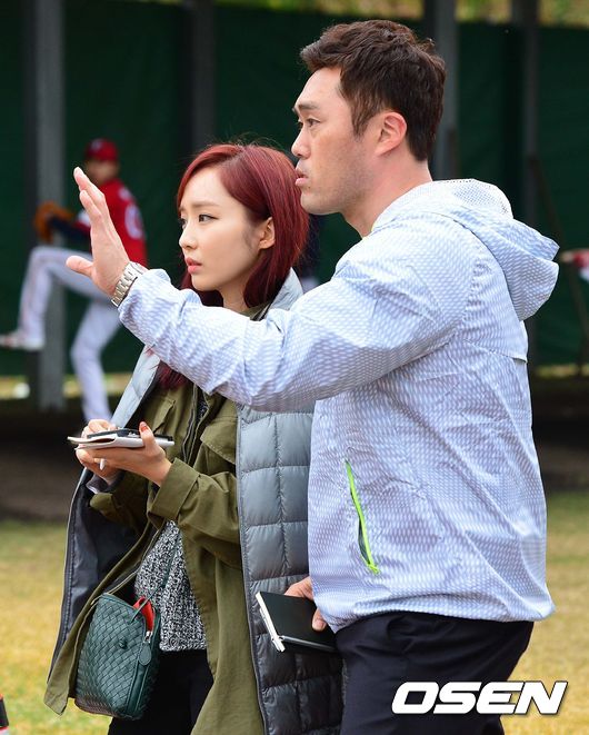 윤태진 아나운서와 조성환 해설위원이 KIA 선수들의 훈련을 지켜보며 대화를 나누고 있다.