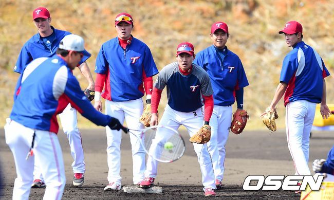 KIA 야수들이 김민호 수비코치의 라켓으로 날리는 테니공을 받아내는 수비 훈련을 하고 있다.
