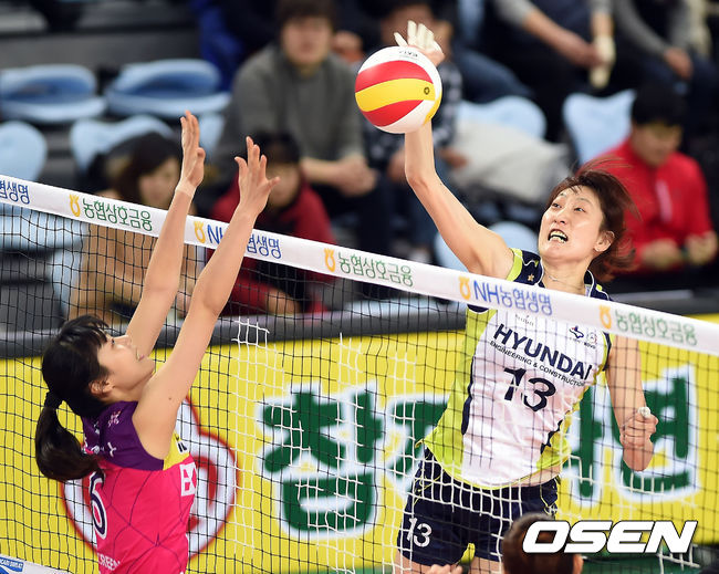 1세트 현대건설 김세영이 공격을 하고 있다.