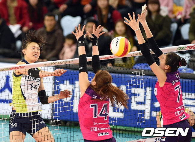 현대건설은 12일 인천 계양체육관에서 열린 NH농협 2014~2015 V-리그 5라운드 흥국생명과의 경기에서 3-0(26-24, 25-15, 25-7)으로 승리했다. 4연승을 거둔 현대건설은 16승 7패, 승점 46점이 됐다. 선두 한국도로공사와의 승점 차이는 단 3점.