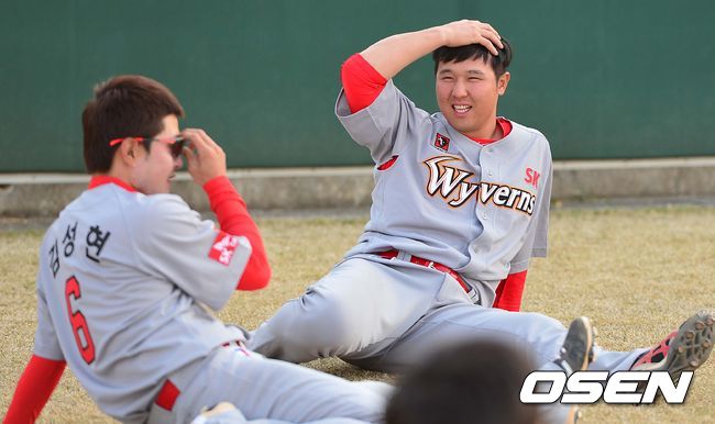 오키나와에 도착한 SK 최정과 김성현이 스트레칭 중 대화를 나누고 있다.