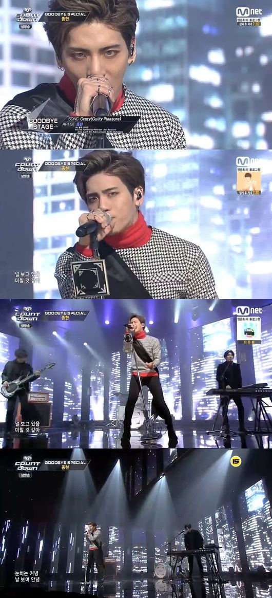 종현은 12일 오후 Mnet 음악프로그램 '엠카운트다운'에서 타이틀곡 '크레이지(Crazy)'로 굿바이 무대를 화려하게 꾸몄다. 앞서 '엠카운트다운' 무대에서는 더블 타이틀곡 '데자부'를 통해 펑키한 매력을 선보여 왔던 종현은 이날 '크레이지' 무대로 카리스마로 꽉 찬 무대를 선사했다.