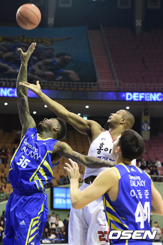 12일 오후 서울 잠실실내체육관에서 '2014-2015 KCC 프로농구' 서울 삼성과 안양 KGC의 경기, 2쿼터 삼성 가르시아와 안양 테일러가 리바운드 경합을 벌이고 있다.