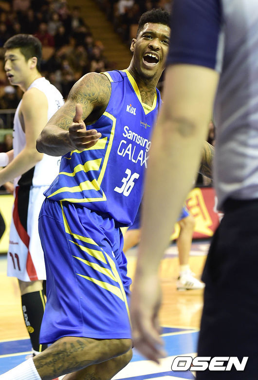 12일 오후 서울 잠실실내체육관에서 '2014-2015 KCC 프로농구' 서울 삼성과 안양 KGC의 경기, 3쿼터 삼성 가르시아가 슛을 성공시키고 세리모니를 하고 있다.