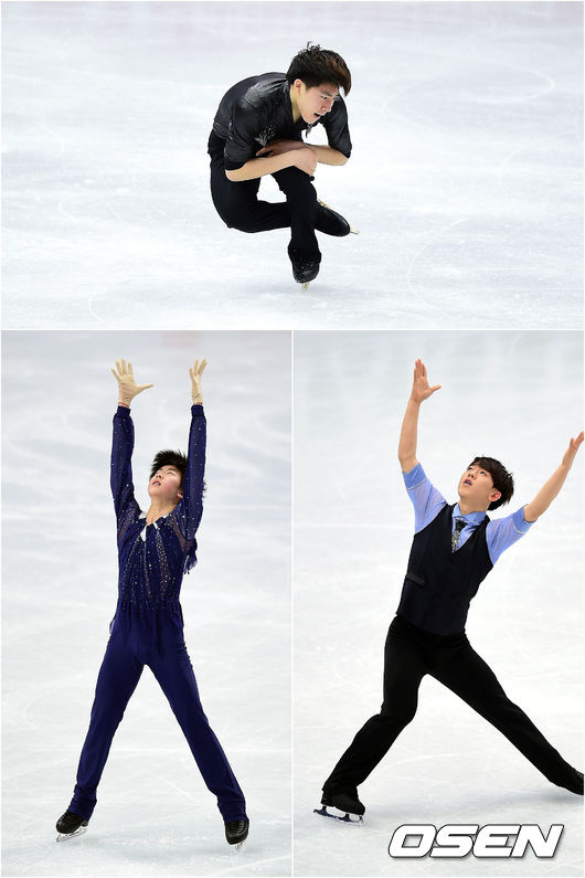 12일 서울 목동아이스링크에서 진행된 '2015 사대륙 피겨선수권 대회' 피겨 남자 싱글 프리부문, 이준형(12시부터 시계방향순)과 김진서, 변세종이 연기를 펼치고 있다.