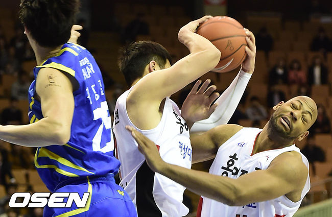 12일 오후 서울 잠실실내체육관에서 '2014-2015 KCC 프로농구' 서울 삼성과 안양 KGC의 경기, 3쿼터 안양 강병현과 윌리암스가 리바운드 시도하고 있다.