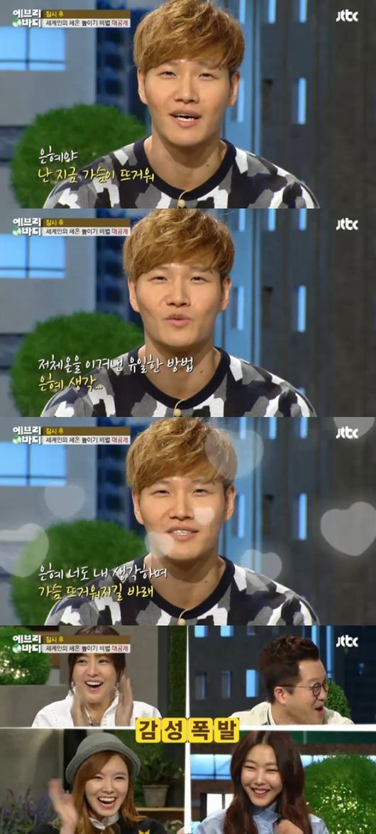 지상렬은 “자꾸 그러면 이상해진다. 깔끔하게 영상편지 보내라”라고 하자 김종국은 화를 참으며 “내가 좀 온도가 많이 올라갔다. 은혜야. 고맙다. 낮았던 온도가 네 얘기하니 올라가네”라고 말해 패널들을 놀라게 했다.