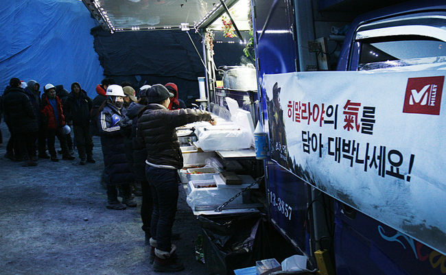이번 밥차 응원은 영하의 칼바람이 몰아치는 날씨 속에 불철주야 촬영을 이어가고 있는 촬영팀을 위해 엄홍길 대장이 직접 밀레에 제안한 것으로 알려졌다. 영화 관계자 측은 "밀레와 엄홍길 대장이 한겨울 강추위에 맞서 분투하고 있는 '히말라야' 팀 전원에게 든든한 지원군이 되었다"며 "특히 엄홍길 대장의 특별한 응원에 힘입어 배우들과 스태프들이 더욱 힘을 내 촬영에 임하고 있으니 많은 기대 바란다"고 전했다.