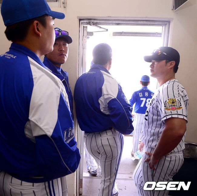 경기 시작에 앞서 한신 오승환과 삼성 선수들이 인사를 나누고 있다.
