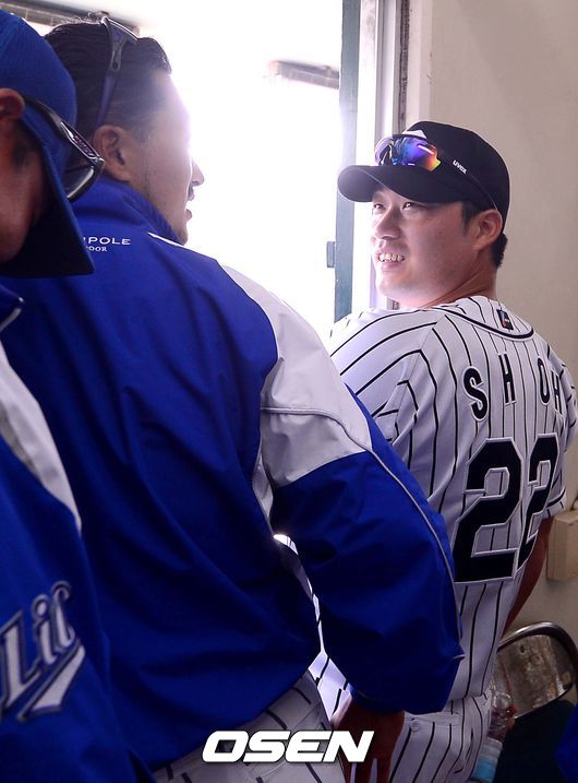 한신 오승환이 친정팀 삼성의 더그아웃을 방문해 권오준과 대화를 나누고 있다.