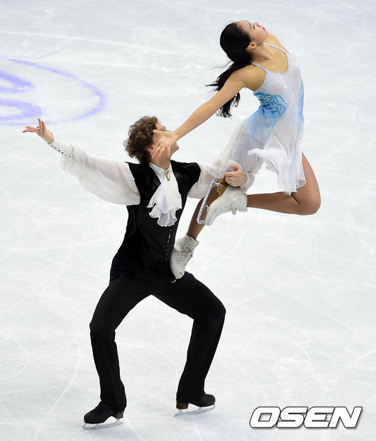 13일 서울 목동아이스링크에서 진행된 '2015 사대륙 피겨선수권 대회' 아이스댄스에서 레베카김과 끼릴 미노프가 연기를 펼치고 있다.