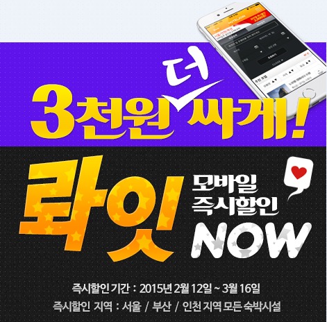 국내·해외 호텔&리조트 할인예약 전문 호텔조인(www.hoteljoin.com)에서 발 빠르게 늘어나고 있는 모바일예약자들을 겨냥, 서울, 부산, 인천 지역의 모든 숙박시설을 모바일로 예약 시 조건 없이 PC보다 3000원 즉시 할인해주는 이벤트를 진행 중에 있다.