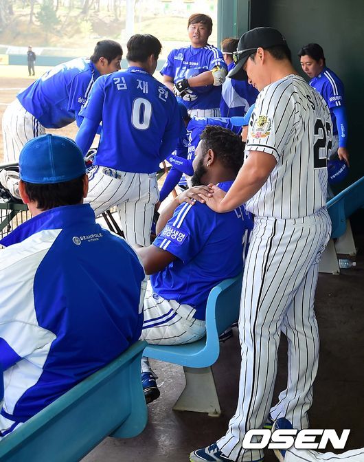친정팀인 삼성 더그아웃을 찾은 한신 오승환이 나바로를 비롯한 동료들과 코치진에게 인사하고 있다.
