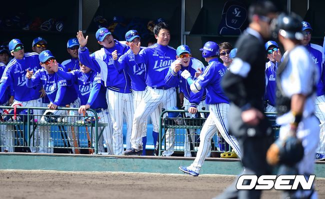 2회초 삼성 공격 2사 3루 상황 김상수가 달아나는 좌월 투런포를 날리고 홈을 밟은 뒤 더그아웃 동료들과 인사를 나누고 있다.