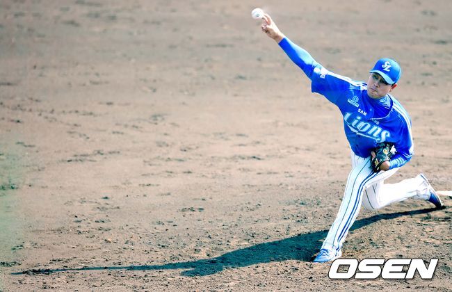 4회말 한신 공격 때 마운드에 오른 삼성 투수 김건한이 힘차게 공을 뿌리고 있다.
