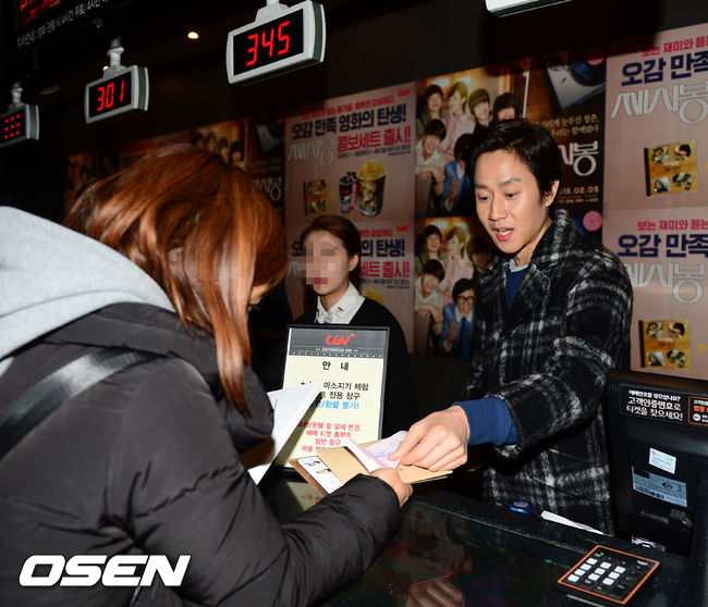 정우,'일일 미소지기, 영화 재미있게 보세요'