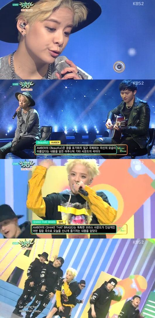 엠버는 13일 오후 방송된 KBS 2TV ‘뮤직뱅크’에서 ‘뷰티풀(Beautiful)’과 ‘세이크 댓 브라스(Shake that brass)’를 열창, 화려한 무대를 꾸몄다.