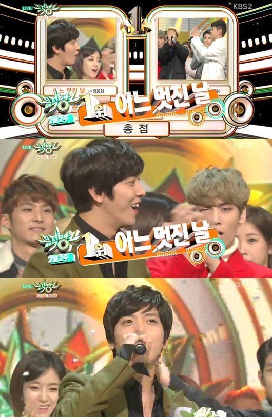 정용화는 13일 오후 방송된 KBS 2TV ‘뮤직뱅크’에서 타이틀곡 ‘어느 멋진 날’로 자이언티&크러쉬의 ‘그냥’을 제치고 1위를 차지했다.