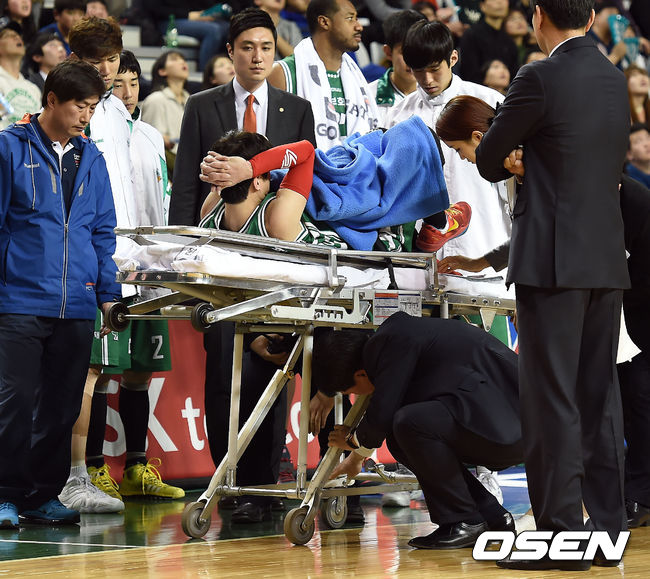4쿼터 동부 박지현이 오른쪽 다리 통증으로 들것에 실려 나가고 있다.