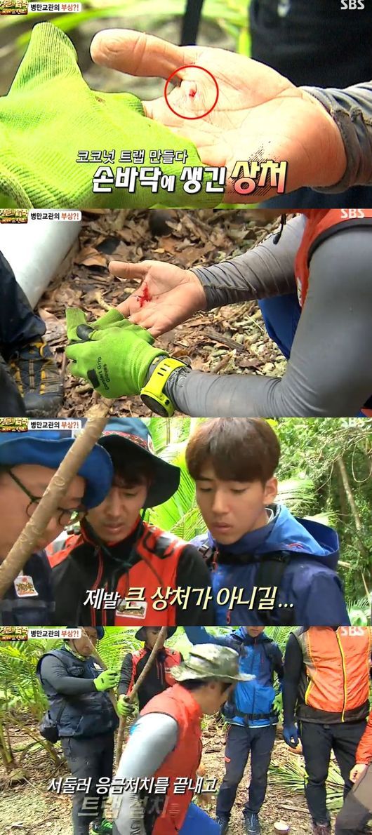 13일 방송된 SBS '정글의 법칙'에서는 급작스러운 부상을 당하는 김병만의 모습이 그려졌다. 김병만은 코코넛 트랩을 만들다 칼에 찔리고 상처는 생각보다 깊었다.