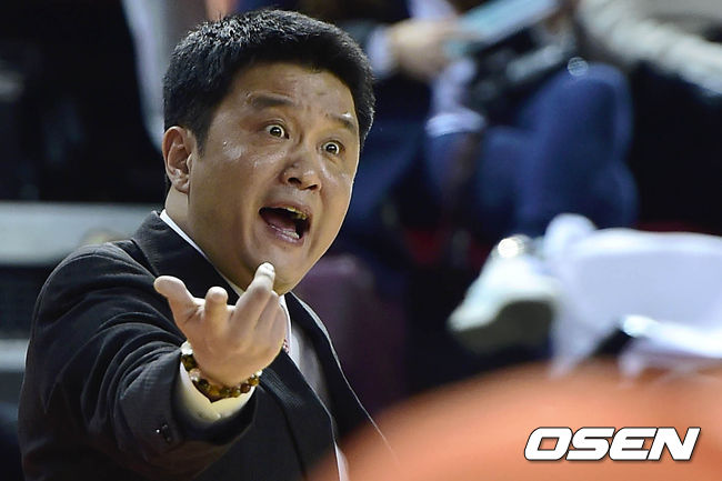 1쿼터 전자랜드 유도훈 감독이 작전지시를 하고 있다.