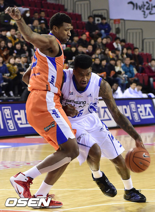 2쿼터 삼성 가르시아가 전자랜드 포웰의 수비를 피해 돌파시도하고 있다.