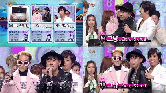 자이언티&크러쉬는 앞서 지난 11일 케이블채널 MBC뮤직 '쇼! 챔피언'에서도 1위를 차지한 바 있다. 이로써 '그냥'으로 2개의 1위 트로피를 받게된 것.
