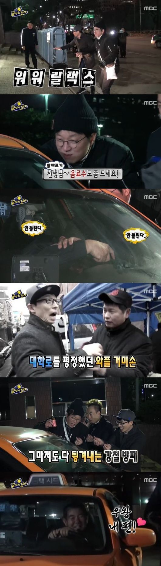 유재석은 "잠시만 내려주시면 안 되냐"고 애원했고, 택시기사는 귀를 막고 외면해 웃음을 자아냈다.