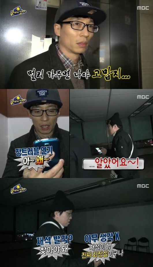 이에 유재석은 급히 화장실 안에서 정형돈의 전화를 받았다. 배탈이 난 것처럼 속이기 위한 것. 유재석은 "나 지금 화장실"이라고 말했고, 정형돈은 "화장실? 알았다"고 답했다.
