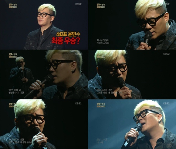 윤민수는 14일 오후 방송된 KBS 2TV 예능프로그램 '불후의 명곡-전설을 노래하다'(이하 불후의 명곡)에서 이문세의 '옛사랑'을 불러 443점을 기록, 문명진과 노브레인을 제치고 2연승을 달성하면서 최종 우승했다.