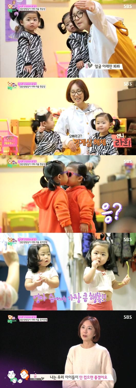 슈는 지난 14일 방송된 SBS 예능프로그램 ‘오 마이 베이비’에서 남편 임효성, 아들 임유, 그리고 쌍둥이 딸 라희·라율과 첫 등장을 했다. 세 아이의 엄마의 일상은 고되기 짝이 없었다. 아침부터 요리를 하며 울음바다가 된 아이들을 달래기 일쑤였다. 유치원을 가야 하는 임유와 칭얼거리는 쌍둥이 딸을 동시에 돌보느라 진이 빠졌다.