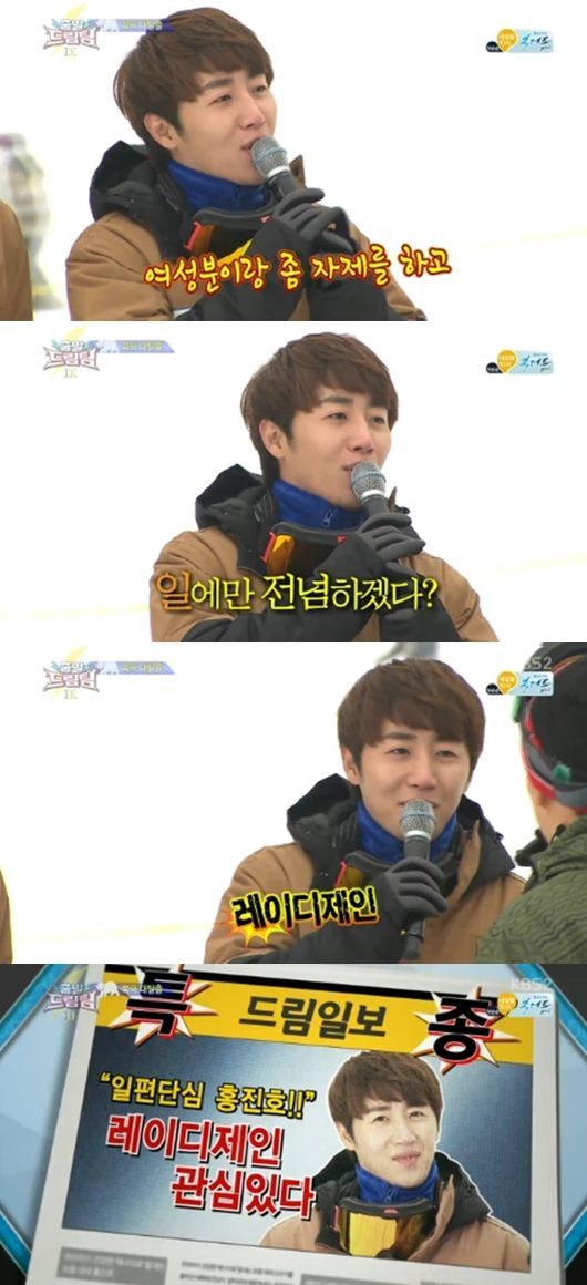 홍진호는 15일 방송된 KBS 2TV 예능프로그램 ‘출발드림팀2’에서 “요즘 누구와 썸을 타냐”는 말에 “여성분과는 자제하고, 일과 썸을 타고 있다”고 말했다.