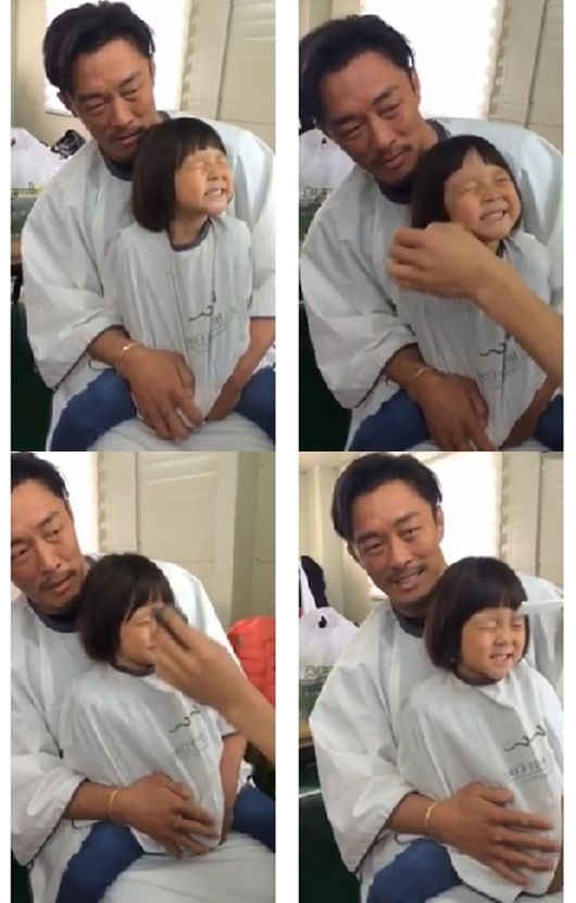 사랑이는 추성훈의 “눈 감아”라는 말에 따라 눈을 질끈 감은 깜찍한 모습이다. 사랑이의 잔뜩 찡그린 표정에 아빠 추성훈은 물론, 머리를 자르는 미용사와 주변 사람들까지 웃음을 참지 못한다.