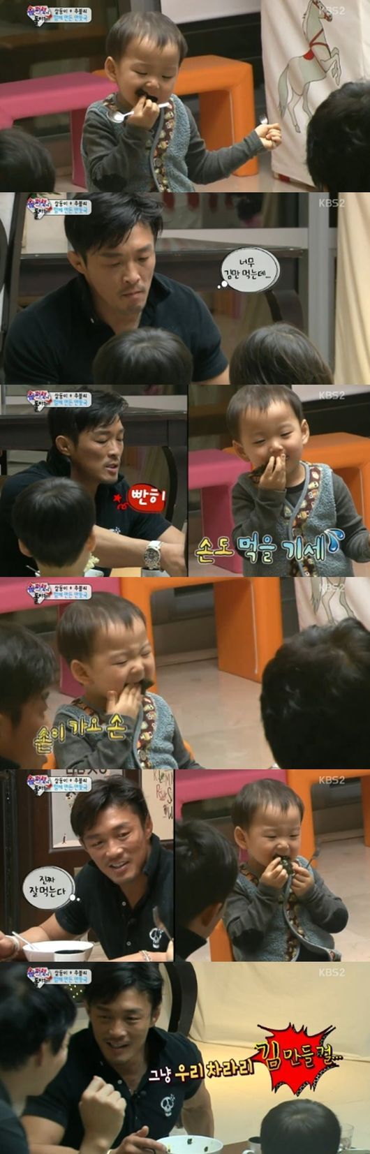 추성훈은 힘들게 만든 만둣국을 외면하는 민국이를 황당하게 바라보며 “우리 차라리 김 만들 걸 그랬다”고 말해 송일국을 웃음 짓게 했다.