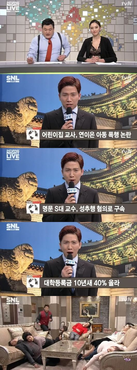 지난 14일 방송된 첫 회에 등장한 어린이집 교사 폭행, 학생을 성추행한 대학교수, 외모를 중시하는 기업의 취업, 그리고 현재 방영중인 MBC 드라마 '압구정 백야'의 임성한 작가를 정면으로 디스한 내용 등은 이런 풍자부활의 첫 단추를 뀄다고 평가 받았다.