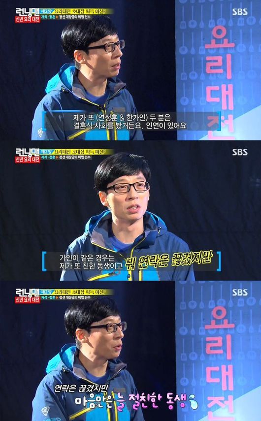 유재석은 제작진과 진행된 인터뷰에서 "한가인과 연정훈의 결혼식 사회를 봤다. 한가인과는 절친이다. 연락은 끊겼지만.."이라고 말해 웃음을 자아냈다.
