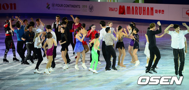 15일 오후 서울 목동아이스링크에서 진행된 '2015 사대륙 피겨선수권 대회' 갈라쇼, 갈라쇼가 끝나며 선수들이 빙판 한가운데서 춤을 추고 있다.
