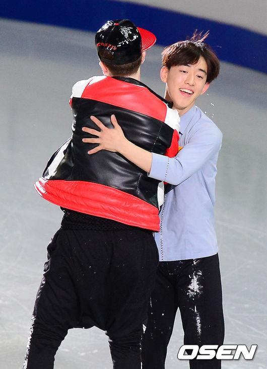 15일 오후 서울 목동아이스링크에서 진행된 '2015 사대륙 피겨선수권 대회' 갈라쇼, 갈라쇼가 끝나며 한국의 김진서와 우즈벡의 미샤 지이가 포옹을 하고 있다.
