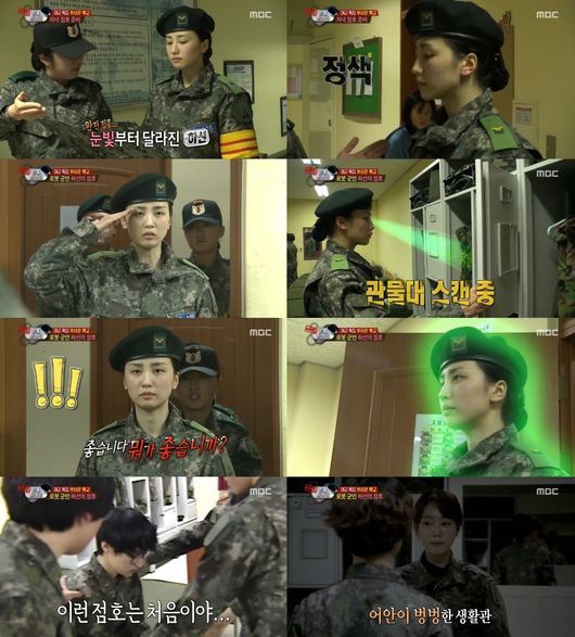 15일 오후 6시 10분 방송된 MBC '일밤-진짜사나이'에서 박하선은 새로운 별명 하나를 얻었다. '대령의 손녀'에 이은 '로봇 군인'이었다. 그는 이미 군인으로 빙의해 먼저 입소한 후보생들까지 얼어 붙게 만드는 강력한 카리스마를 발산했다.