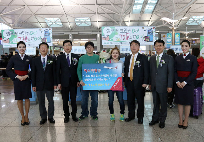 16일 오후 인천국제공항 3층 여객터미널에서 이스타항공 최종구 부사장(오른쪽에서 세 번째), 인천국제공항공사 홍성각 운영본부장(왼쪽에서 세 번째)이 이스타항공 셀프체크인 오픈 기념행사를 첫 번째 이용객들(가운데)과 축하하고 있다.