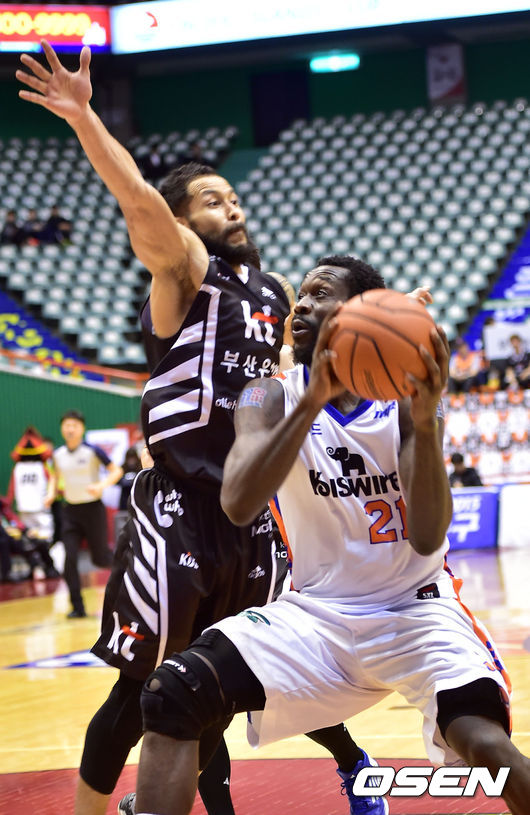 16일 오후 부산 사직실내체육관서 열린 2014~2015 KCC프로농구 부산 KT와 인천 전자랜드의 경기,3쿼터 전자랜드 레더가 kt 전태풍의 블록을 피하고 있다.