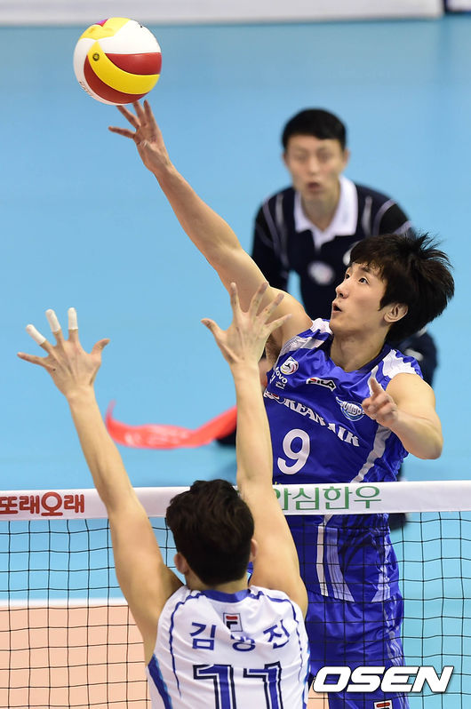 1세트 대한항공 곽승석이 삼성화재 김명진의 수비를 피해 공격시도 하고 있다.